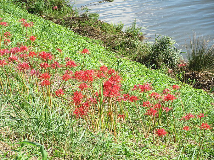 土手の雑草を刈りとられた後の風景。彼岸花だけ残されています。彼岸花の美しさ、さまざまな名前に秘められた歴史、言い伝えから、刈り取るのに躊躇するなど理由がありそうです。