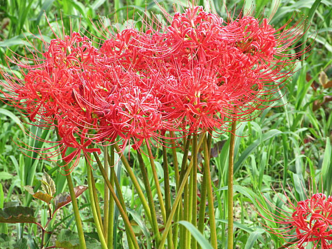 良く知られた別名には「曼珠沙華=まんじゅしゃか・まんじゅしゃげ」があります。仏典に由来した名前で、サンスクリット語で「天界に咲く花」「見る者の心を柔軟にする」といった意味があるそうです。