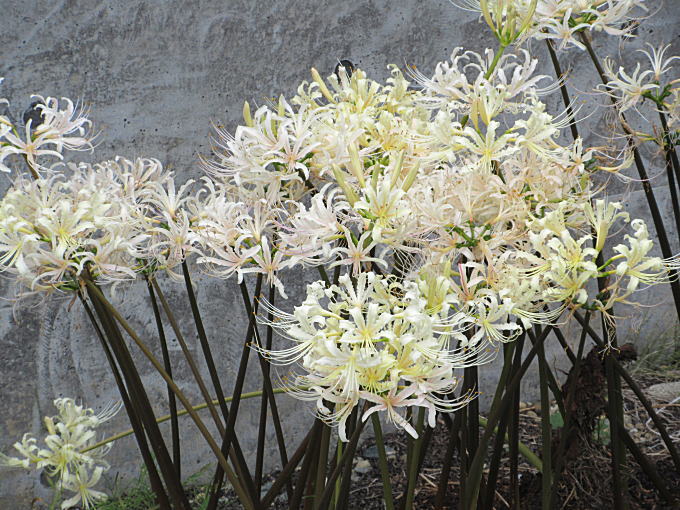 白色(淡い黄色、クリーム色かな?)の彼岸花。「白花曼珠沙華=シロバナマンジュシャゲ」と呼ばれ、赤い彼岸花と彼岸花の仲間である「ショウキズイセン=黄色の花」の自然交雑種だと考えられており、比較的珍しいようです。(10月初めころに撮影)