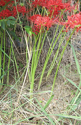 彼岸花は開花時期(9月中旬~10月初旬)に、茎に葉っぱをつけません。葉っぱは花が枯れた(10月中旬~)から春にかけつけ5月頃に枯れます。このため夏から開花時期には葉っぱのない状態になるということです。